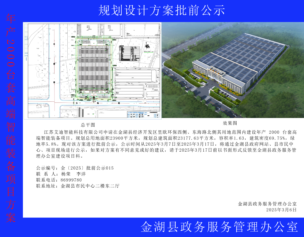 江苏艾迪智能科技有限公司申请在金湖县经济开发区里欧环保西侧、东海路北侧其用地范围内建设年产 2000 台套高端智能装备项目。规划总用地面积23900平方米,规划总建筑面积23177.63平方米,容积率1.63,建筑密度69.75%,绿地率5.8%。现对该方案进行批前公示,公示时间从2025年3月7日至2025年3月17日,将通过金湖县政府网站、县市民中心、项目现场进行公示,如果对方案有不同意见或好的建议,请于2025年3月17日前以书面形式反馈至金湖县政务服务管理办公室建设项目科。