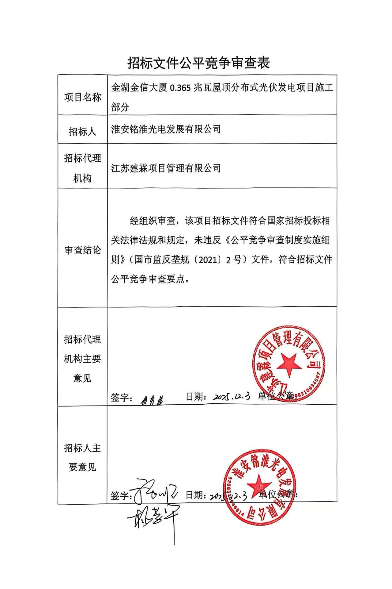 金湖金信大厦0.365兆瓦屋顶分布式光伏发电项目施工部分已经相关部门批准,招标人为淮安铭淮光电发展有限公司,本项目已具备招标条件,现招标方式为公开招标。