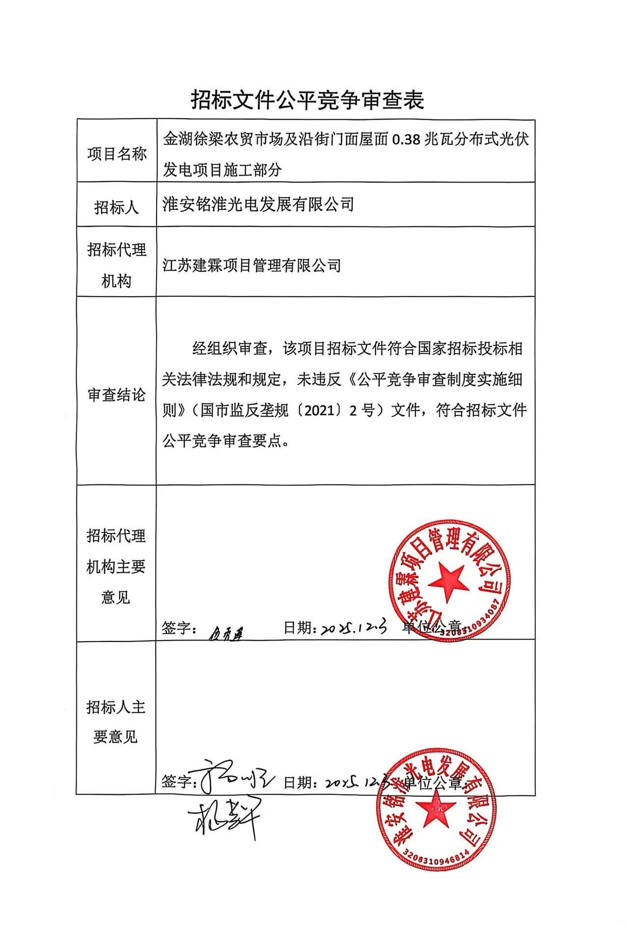 金湖徐梁农贸市场及沿街门面屋面0.38兆瓦分布式光伏发电项目施工部分已经相关部门批准,招标人为淮安铭淮光电发展有限公司,本项目已具备招标条件,现招标方式为公开招标。